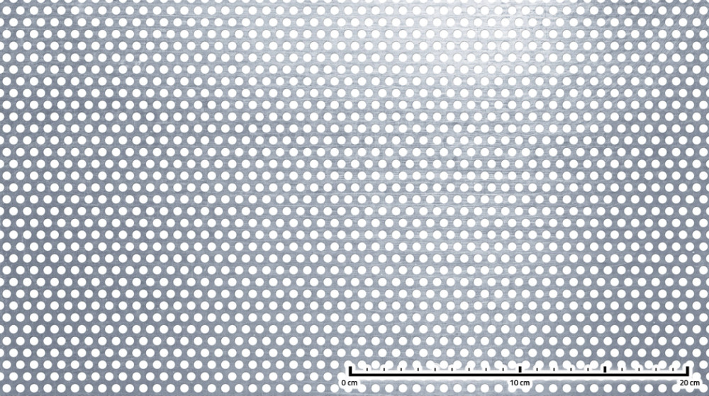Perforált lemez rozsdamentes 1000x2000x1,5 mm tábla 5 mm lyuk Körlyukasztás átlós osztással Szabad áteresztő felület: 35% saválló inox