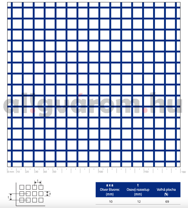 Perforált lemez horganyzott 1250x2500x1 mm tábla 10 mm szögletes négyzetes lyuk Szabad áteresztő felület: 69%