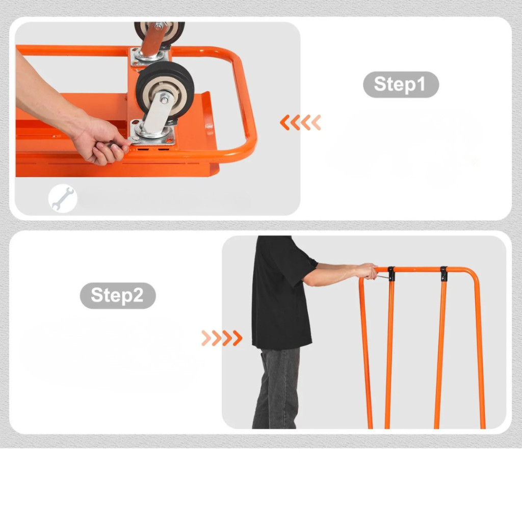 A platós kocsi összeszerelése rendkívül egyszerű, mindössze két lépésből áll: a kerekek és a fogantyú rögzítését követően azonnal használatra kész. Használaton kívül a szerkezet kompakt méretre szétszedhető, így tárolása nem igényel sok helyet – ideális raktári vagy otthoni használatra egyaránt.