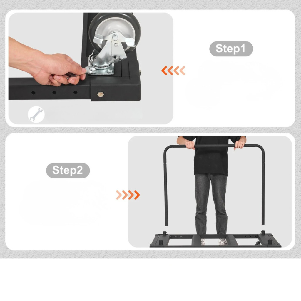 A szerelés mindössze két lépésből áll: a kerekek és a fogantyú rögzítése után a kocsi azonnal használatra kész. A szétszerelhető kialakításnak köszönhetően kompakt méretre csukható, így tárolása kevés helyet igényel – ideális megoldás otthoni garázsokba vagy szűk raktárakba is.