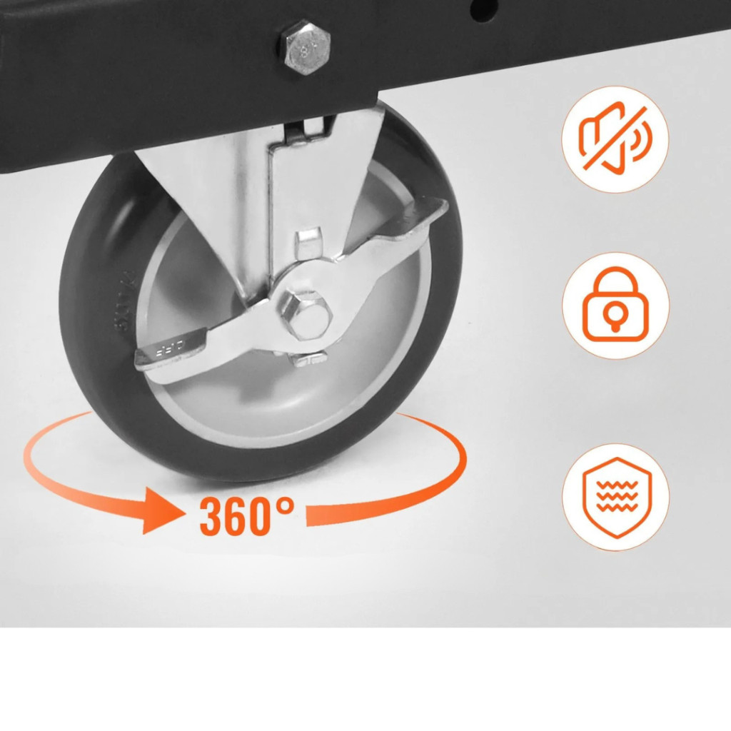 A 13 cm-es PU kerekek halk és egyenletes mozgást biztosítanak bármilyen felületen – legyen az beton, aszfalt vagy csempe. A 360°-ban forgatható univerzális kerekek révén a kocsi kiválóan manőverezhető szűk helyeken is, a rögzítőfék pedig biztonságos álló helyzetet garantál.