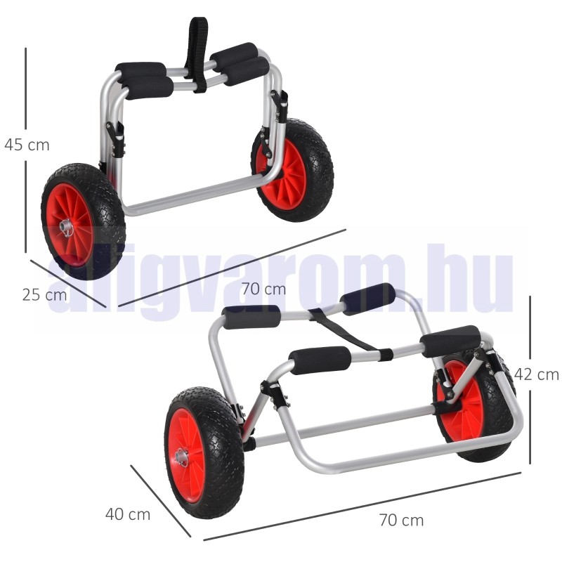 A robosztus alumíniumszerkezet akár 90 kg-os terhet is elbír, így ez a szállítókocsi ideális választás különféle vízi járművek, például kajakok, kenuk és SUP deszkák biztonságos szállítására.