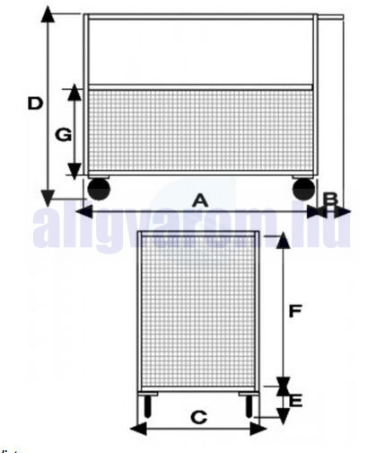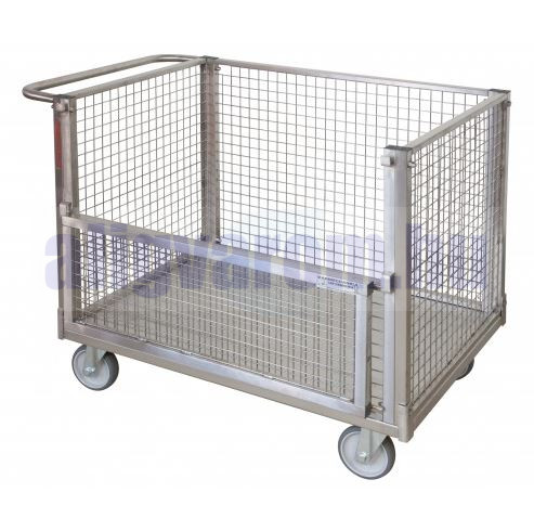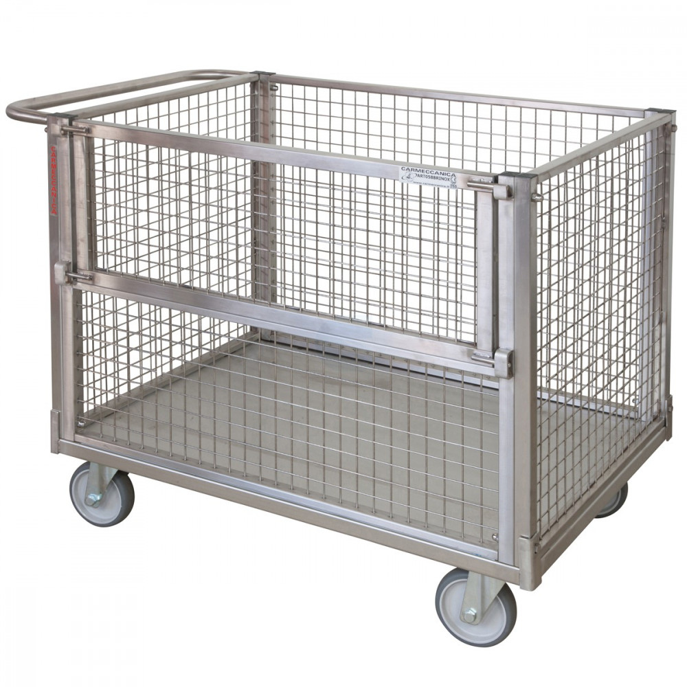 Szállítókocsi 350 kg teherbírású rozsdamentes acélból 4 hálós oldallal, egyik oldala lenyitható