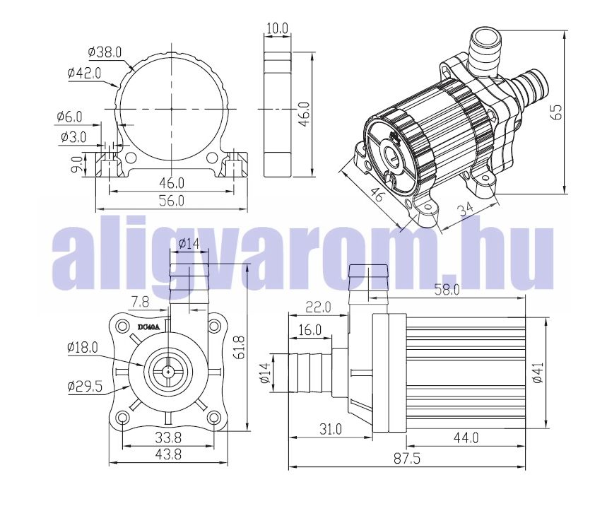 Elektromos szivattyú, pl. akkumulátorról vagy napelemmel történő meghajtáshoz. Akvárium, szökőkút, kerti tó vizének mozgatásához.