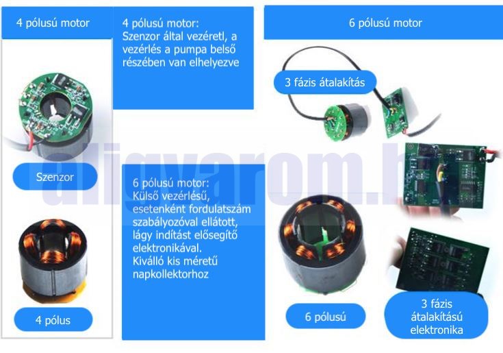 Szénkefe mentes 3 fázisú elektromos keringető szivattyú, pl. akkumulátorról vagy napelemmel történő meghajtáshoz, alkalmas lehet napkollektor rendszerben a vízforgatásra is.