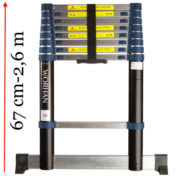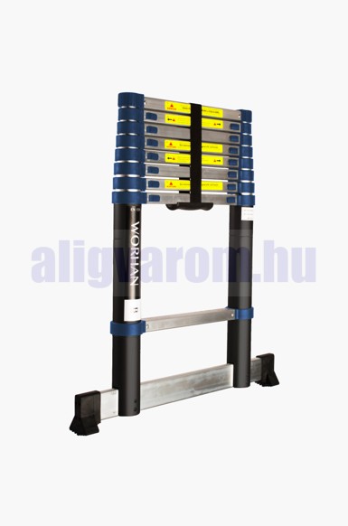 2,6 m magas, teleszkópos alumínium létra 67 cm-re összecsukható. Szélesített támasztólábbal ellátott kivitel