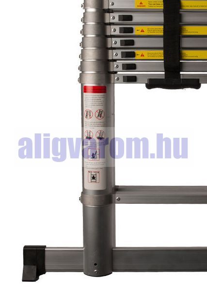 3,2 m magas, teleszkópos alumínium létra 74 cm-re összecsukható.  Szélesített támasztólábbal ellátott kivitel