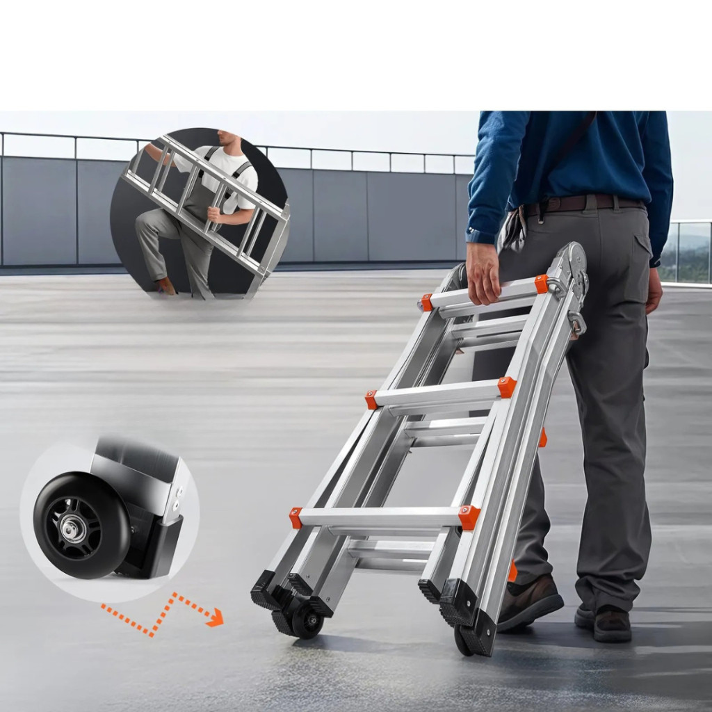 A létra alja dupla kerekekkel van felszerelve, így egy kézzel könnyedén mozgatható. Elfelejtheti a nehéz létrák emelgetését, hiszen ezzel a megoldással gyorsan és kényelmesen viheti egyik helyről a másikra.