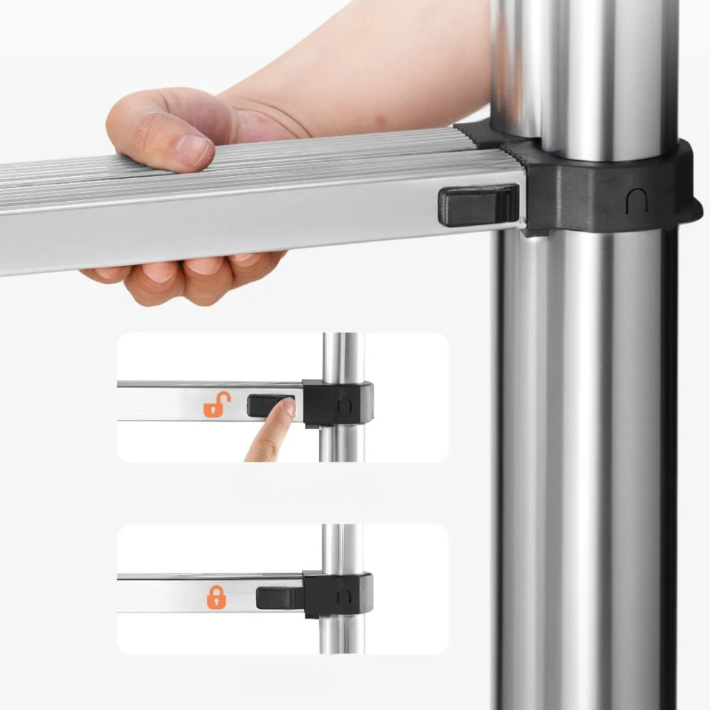 A létra egygombos teleszkópos zárrendszerrel rendelkezik. Minden fok külön reteszelhető, így könnyedén beállíthatja a kívánt magasságot. Az egyszerű működtetésnek köszönhetően a létra gyorsan összecsukható és kinyitható, ami időt és energiát takarít meg.