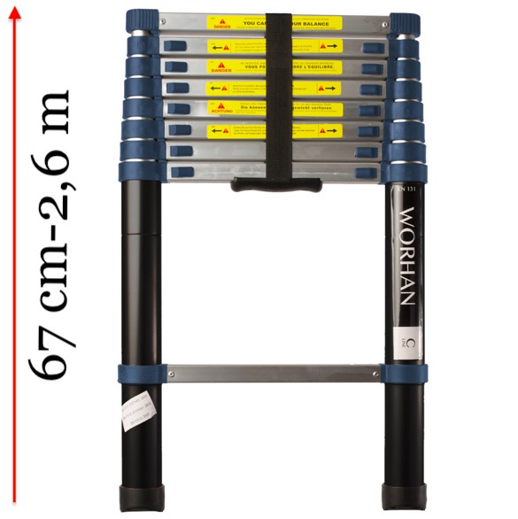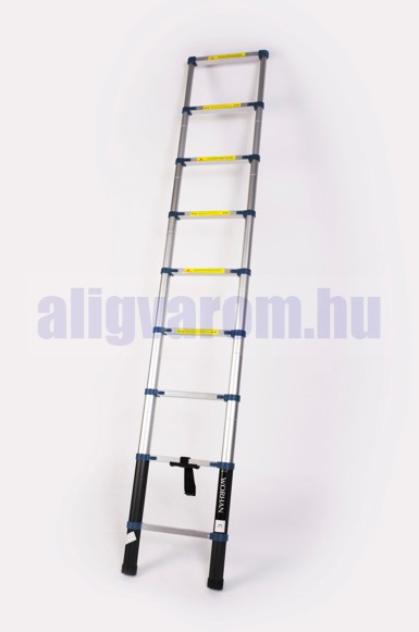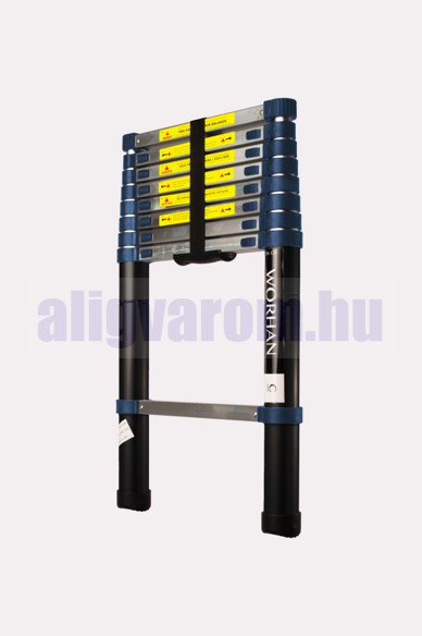 2,6 m magas, teleszkópos alumínium létra 67 cm-re összecsukható. Biztonsági gumitalppal ellátva.