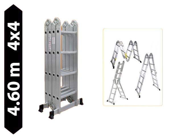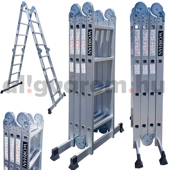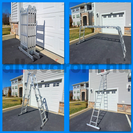 • Négyrészes, multifunkcionálisan használható csuklós létra,könnyen kinyitható, biztonságosan rögzíthető és könnyen összecsukható