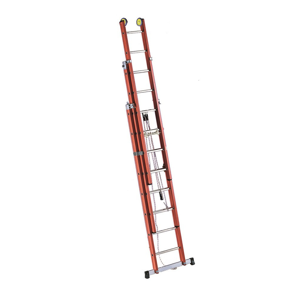 Üvegszálas szigetelt létra, kötéllel kezelhető támasztólétra háromrészes 3x14 fok, 4,1m magas, gördülő kerekekkel