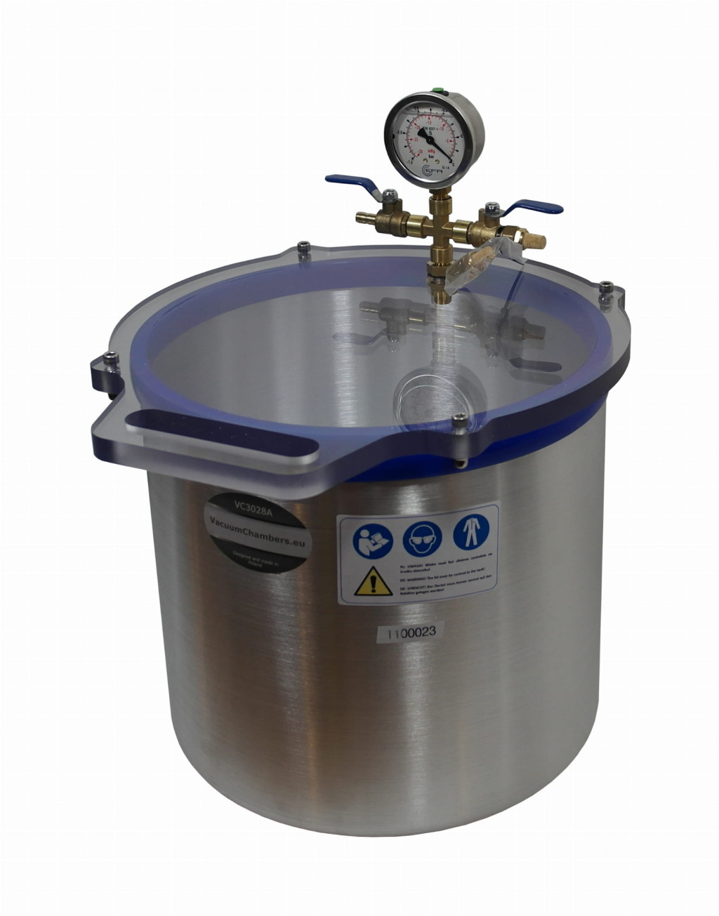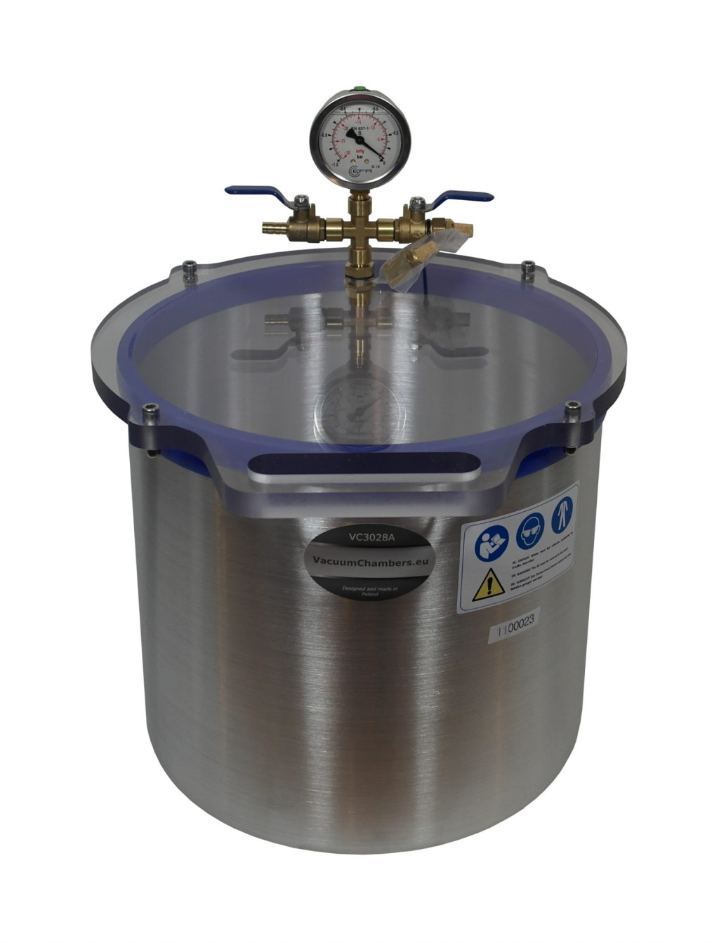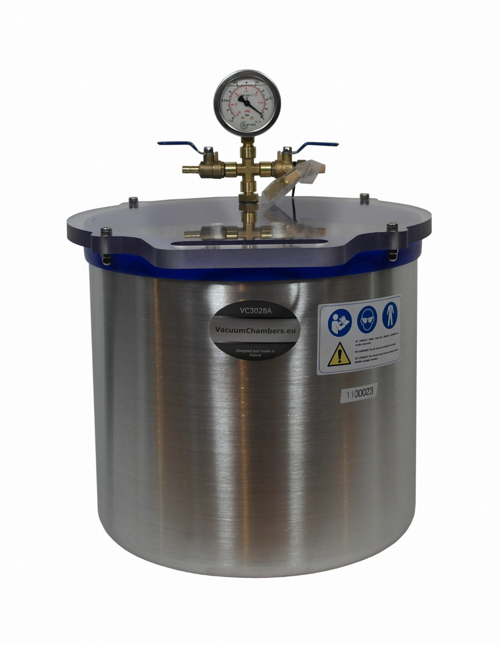 A kamra teste alumíniumból készült, űrtartalma 20,0 liter, belső méretei: átmérője 30 cm, magassága 28 cm. A fedél vastag polikarbonátból készült. A kamra szilikon tömítéssel van ellátva. Az alkalmazott tömítés megbízható és alacsony érzékenységű a mechanikai deformációra. A fedél kiváló átlátszósága lehetővé teszi a gáztalanítási folyamat megfigyelését. Két golyósszelep lehetővé teszi a gáztalanítási folyamat szabad szabályozását, a felszerelt glicerin vákuummérő pedig a kamrában lévő aktuális vákuumot mutatja. A kamra beszívó levegő szűrővel van felszerelve, amely hatékonyan megakadályozza, hogy bármilyen szennyeződés kerüljön a gáztalanított anyagba. A kamra egy pneumatikus csatlakozóval ellátott szivattyúhoz csatlakozik, amely egy 8 mm belső átmérőjű és 1,5 m hosszú megerősített tömlőbe van behelyezve. A termék a legmagasabb minőségű anyagokból készült, és a menetek márkás tömítőanyaggal vannak ellátva.