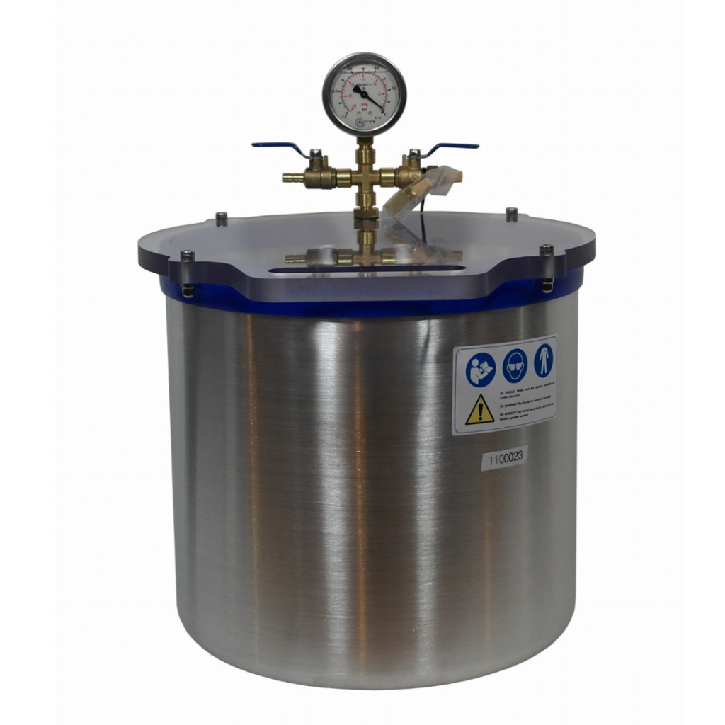 A kamra teste alumíniumból készült, űrtartalma 20,0 liter, belső méretei: átmérője 30 cm, magassága 28 cm. A fedél vastag polikarbonátból készült. A kamra vulkanizált szilikon tömítéssel van ellátva. Az alkalmazott tömítés megbízható és alacsony érzékenységű a mechanikai deformációra. A fedél kiváló átlátszósága lehetővé teszi a gáztalanítási folyamat megfigyelését. Két golyósszelep lehetővé teszi a gáztalanítási folyamat szabad szabályozását, a felszerelt glicerin vákuummérő pedig a kamrában lévő aktuális vákuumot mutatja. A kamra beszívó levegő szűrővel van felszerelve, amely hatékonyan megakadályozza, hogy bármilyen szennyeződés kerüljön a gáztalanított anyagba. A kamra egy pneumatikus csatlakozóval ellátott szivattyúhoz csatlakozik, amely egy 8 mm belső átmérőjű és 1,5 m hosszú megerősített tömlőbe van behelyezve. A termék a legmagasabb minőségű anyagokból készült, és a menetekhez márkás tömítőanyagot használtak.