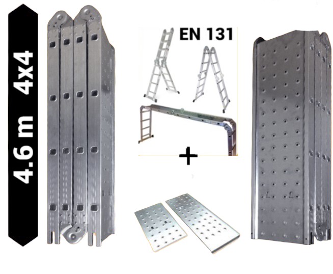 Trepnis multifunkciós csuklós létra pallóval 4,6 méter magas, platfrommal, 4 részes összehajtható, összecsukható, 4x4 létrafok