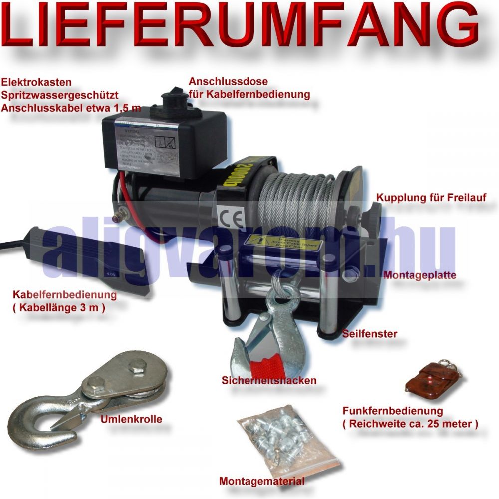 Távirányítós elektromos csörlő vontató motoros drótkötél 12V 900 kg 2000 LBs kábeles távirányító