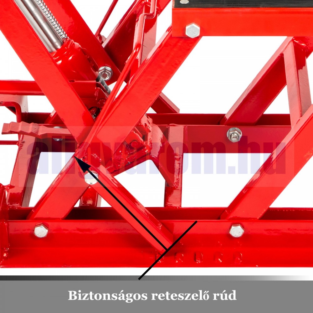 A motorral végzett munka biztonsága érdekében egy reteszelő rúd tartja az ollós emelőt felfüggesztve akkor is, ha a hidraulikus nyomás megszűnt.