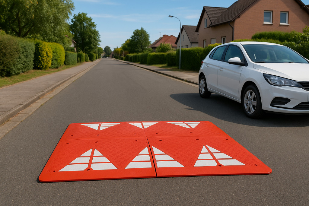 Forgalom lassító párna 180cm széles 150cm hosszú , fekvőrendőr végelem, 65 mm magas 900 mm széles 750 mm hosszú forgalom lassító küszöb, B68 piros színben