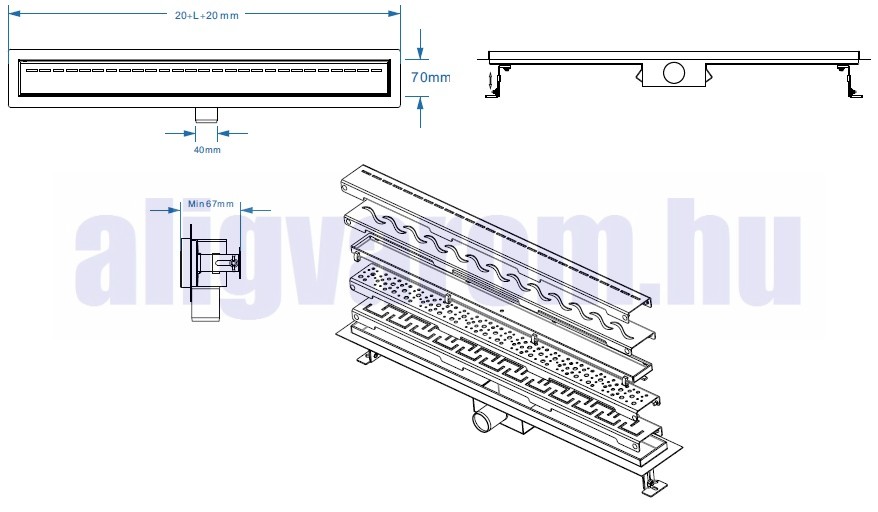 Szélessége: 70 mm, a burkolandó csempeszegéllyel + 2-2 cm!