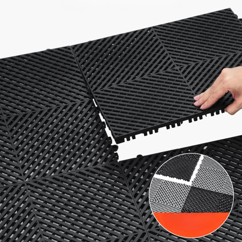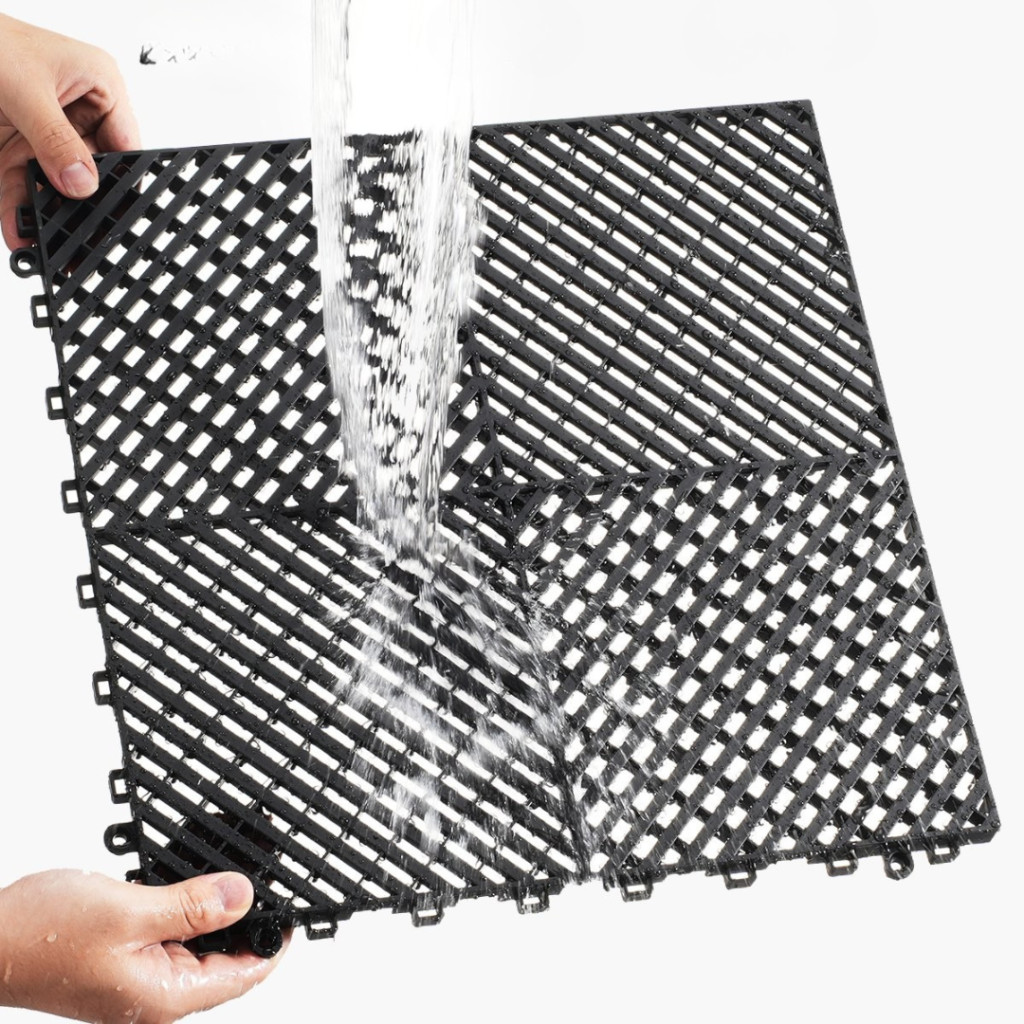 A csúszásmentes, lyukacsos kialakítás biztonságos közlekedést biztosít még nedves környezetben is, így tökéletes garázsba, autómosóba, kertbe, műhelybe vagy ipari területekre.