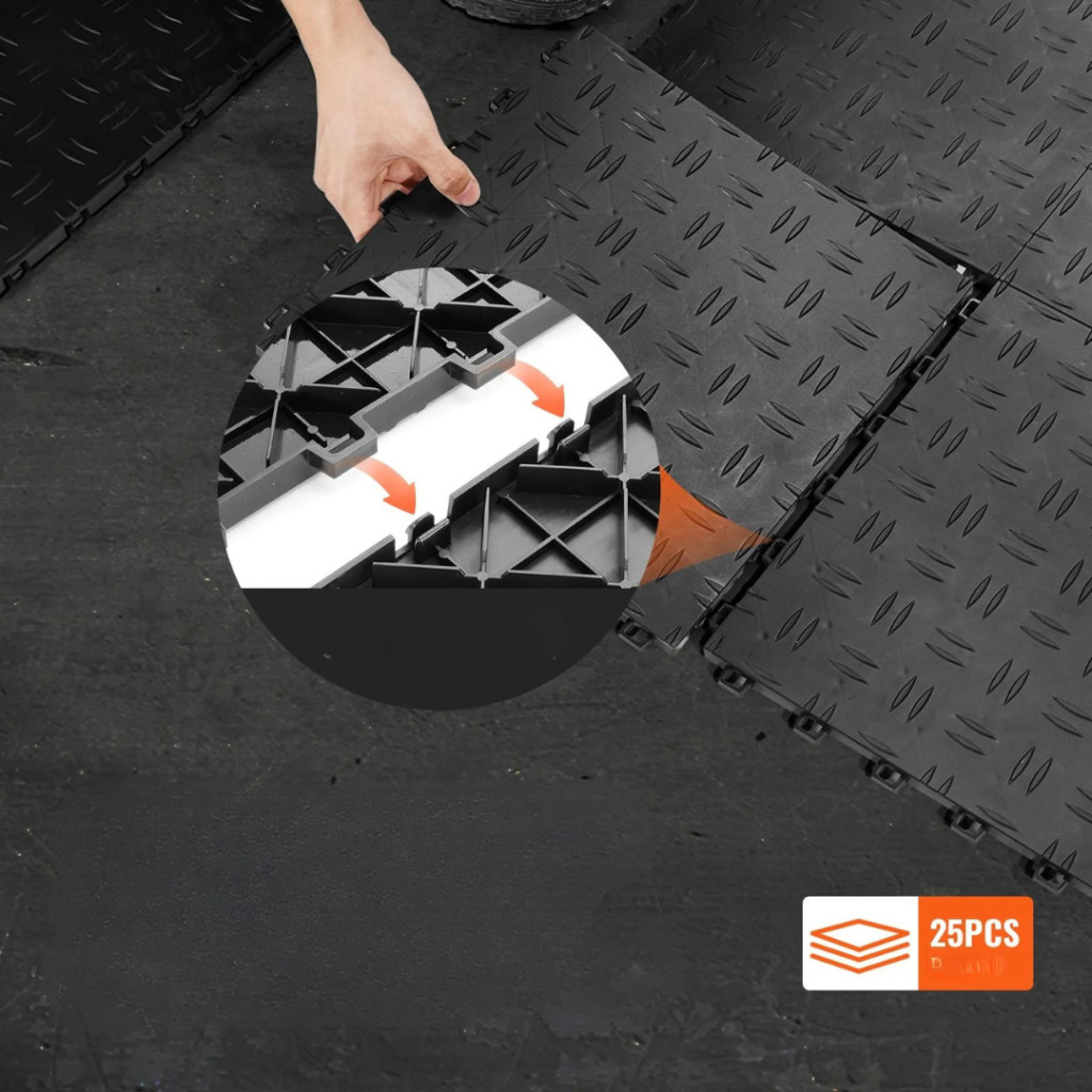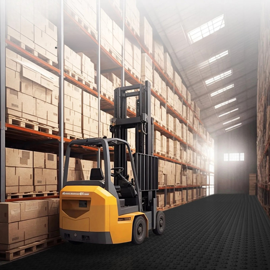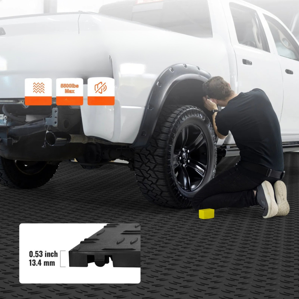A 13,4 mm vastag, PP műanyagból készült burkolólapok akár 2,49 tonna terhelést is elviselnek, így ideálisak autók, motorok vagy nehéz műhelyfelszerelések alá.