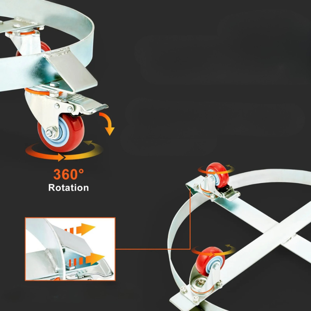 A 250 literes hordószállító szett (2 db hordógörgő) ideális választás minden olyan ipari vagy háztartási feladathoz, ahol nagy méretű hordók, tartályok vagy más nehéz eszközök mozgatására van szükség. A strapabíró szénacél keret és a négy univerzális kerék fékekkel garantálja a stabilitást és a biztonságos használatot akár szűk helyeken is.