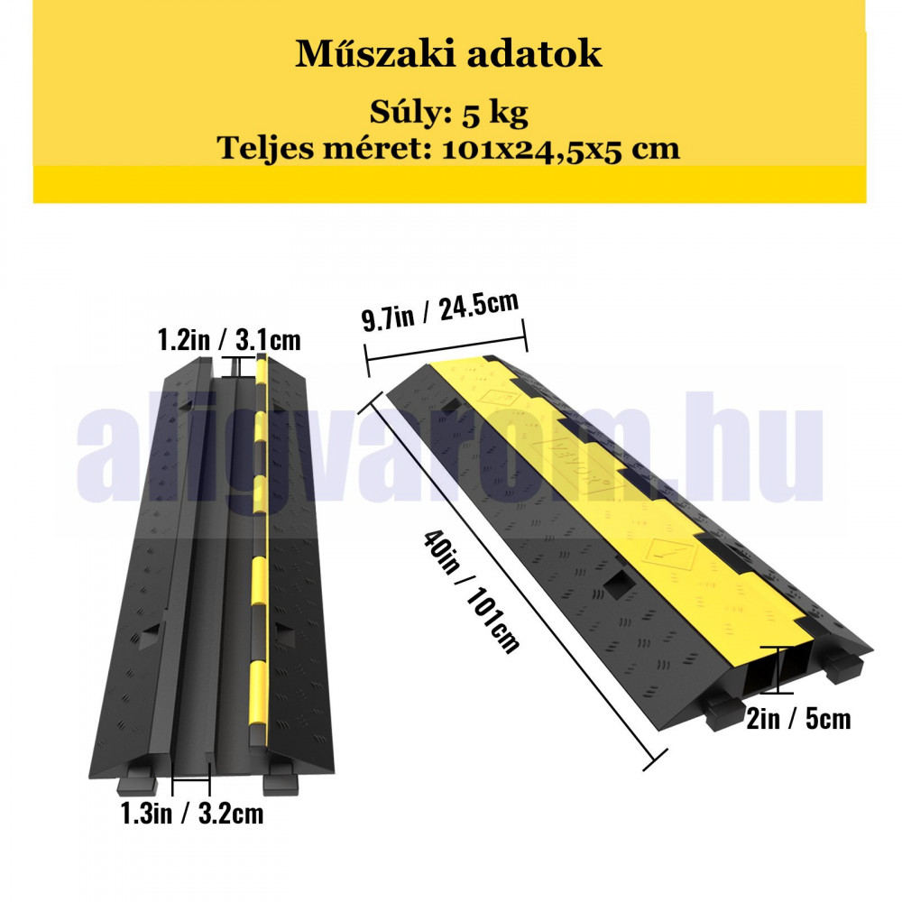 A hagyományos fekete-sárga szín jobb láthatóságot biztosít éjszaka és gyengén megvilágított környezetben. A túlfutásvédelem egyedi kialakítású, amely felhívja a járókelők és az autósok figyelmét, és lassításra készteti őket. A több mint 4989 kg teherbírás biztosítja, hogy a kábelvédő fölött úgy haladjon át autójával, hogy nem zavarja a benne futó kábeleket.