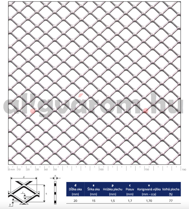 Expandált lemez acél 1000x2000x1,5 mm tábla 20x15 mm lyuk négyzet alakú nyílások áteresztő felület: 77%