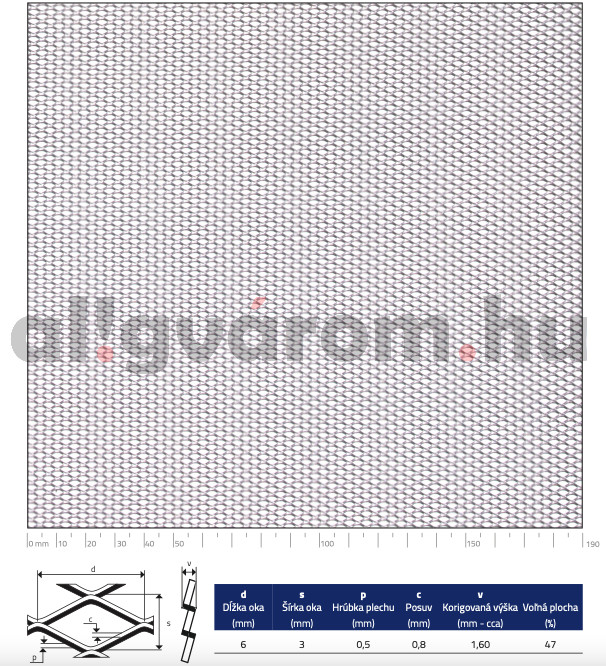 Expandált lemez rozsdamentes 1000x2000x0,5 mm tábla 6x3,5 mm gyémánt lyuk saválló inox 47%-os áteresztő felület