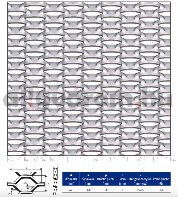 Expandált lemez rozsdamentes 1250x1600x3 mm tábla 47x13,5 mm mm lyuk hatszög áteresztő felület: 23% saválló inox