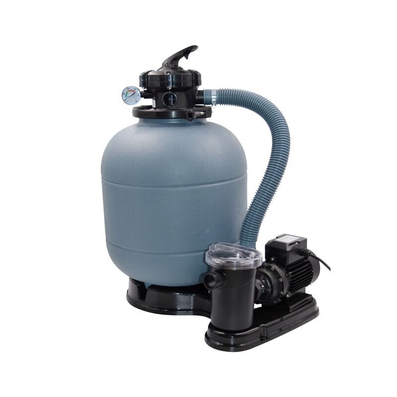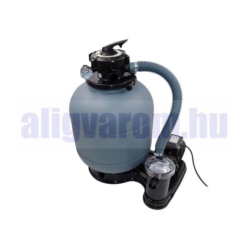 A homokszűrő rendszer 6 m³ szűrőszivattyúval kifejezetten föld feletti és acélfalú medencékhez lett tervezve, legfeljebb 30 000 literes kapacitással.