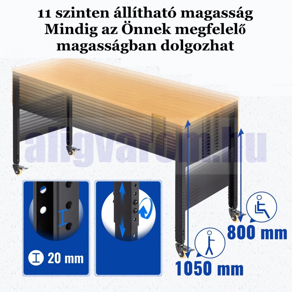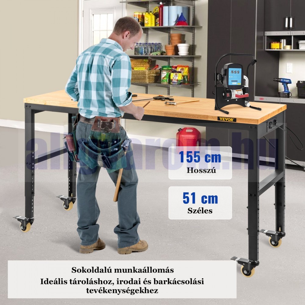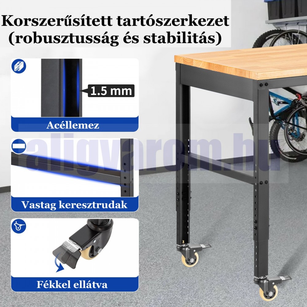 Állítható magasságú munkaasztal 155x51x105 cm 720 kg teherbírású konnektorral felszerelt munkapad