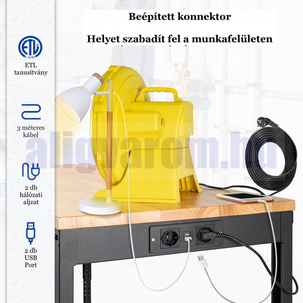 Munkaállomás konnektorokkal van felszerelve, így különböző elektromos szerszámokat és lámpákat használhat. A konnektor 3 méteres kábellel, 2 hálózati aljzattal és 2 USB-A porttal rendelkezik.