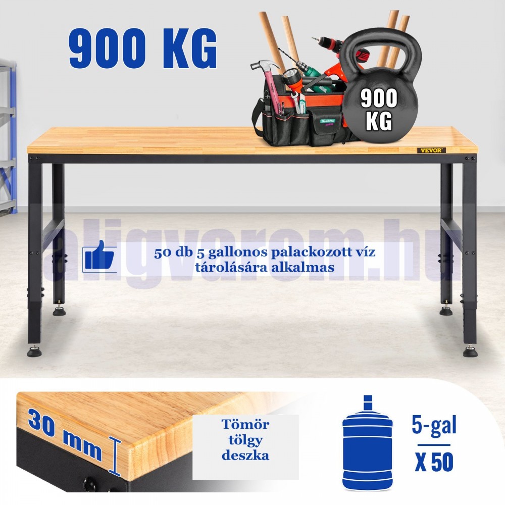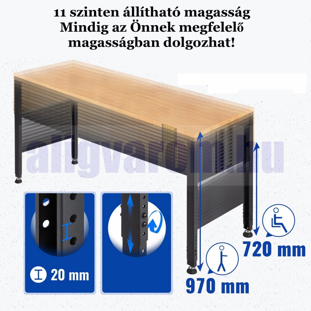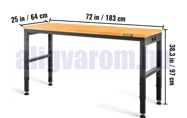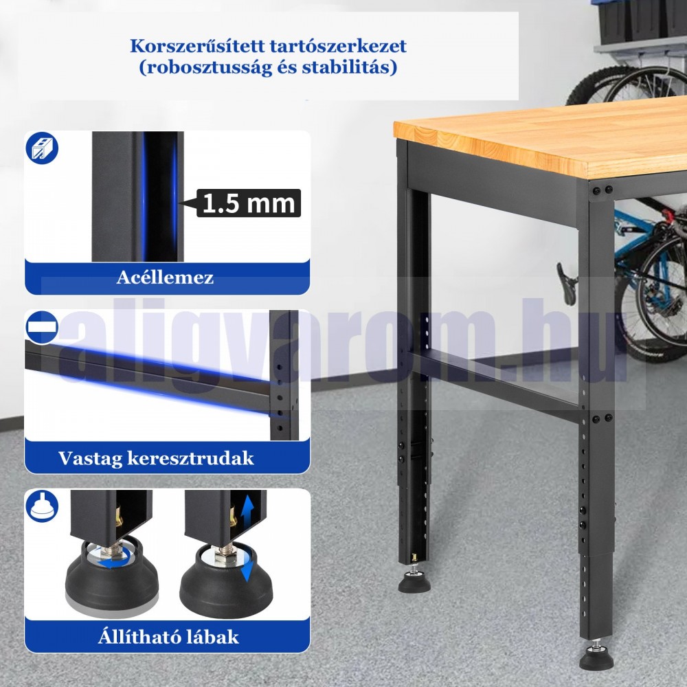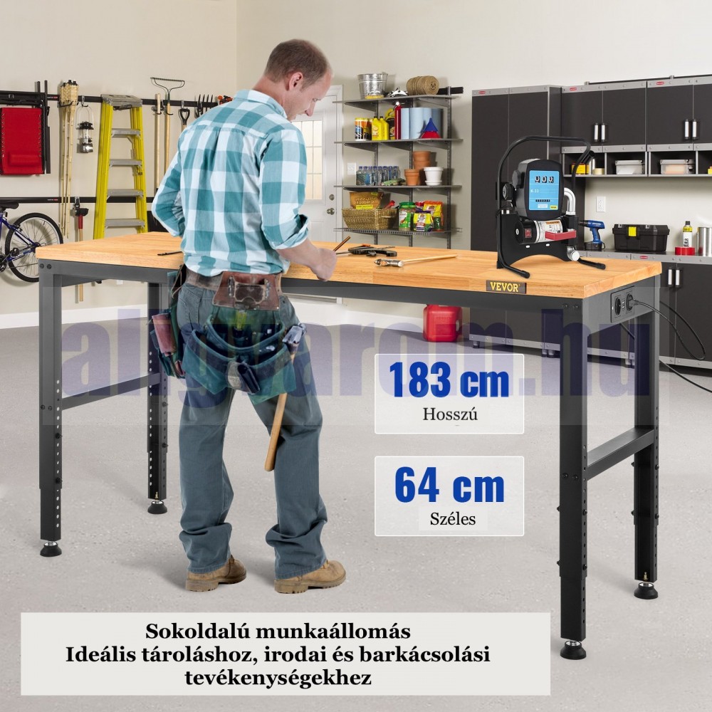 Állítható magasságú munkaasztal 183x64x97 cm 900 kg teherbírású konnektorral felszerelt munkapad