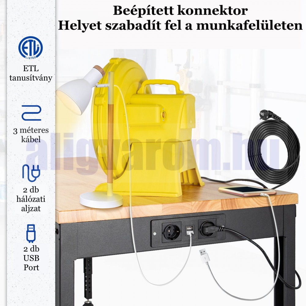 Munkaállomás konnektorokkal van felszerelve, így különböző elektromos szerszámokat és lámpákat használhat. A konnektor 3 méteres kábellel, 2 hálózati aljzattal és 2 USB-A porttal rendelkezik.