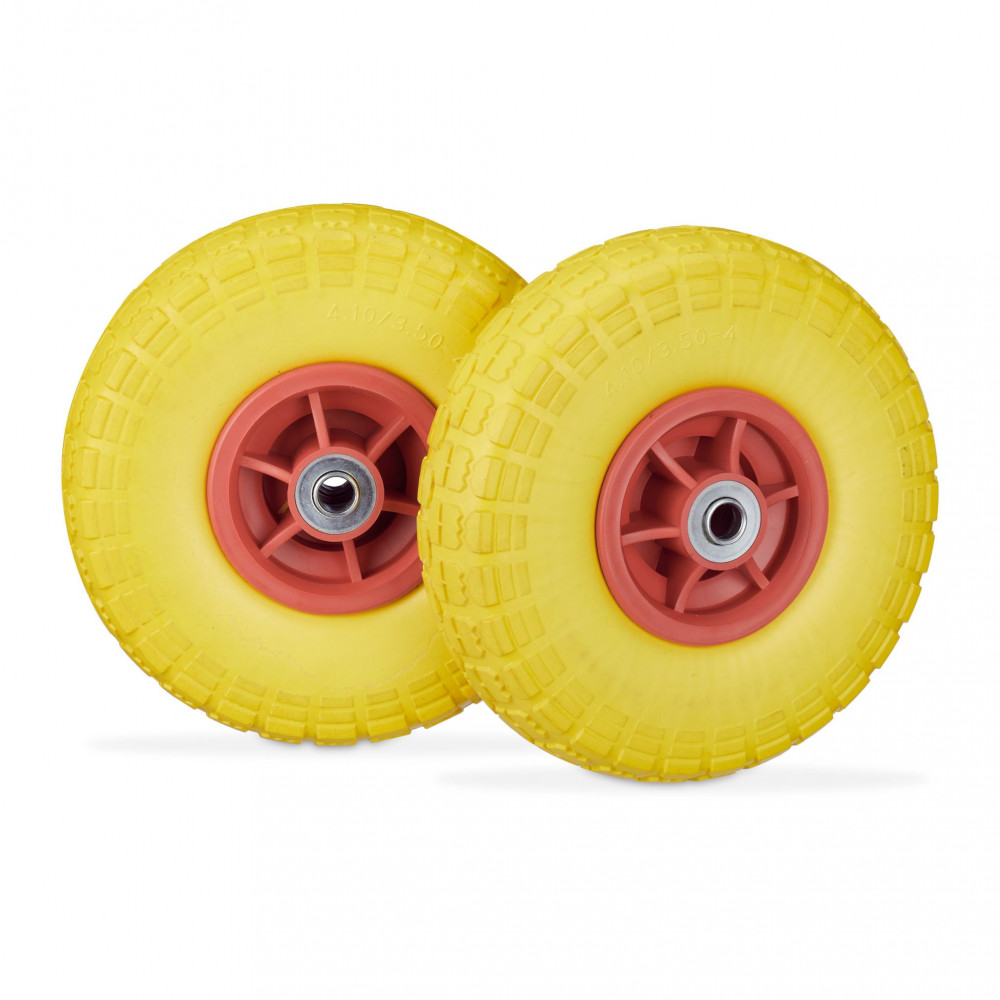 Ø260 mm tömörgumi kerék 2 db 4.1/3.5-4 defektmentes sárga-piros pótkerék műanyag felnivel kézikocsi kiskocsi molnárkocsi talicska