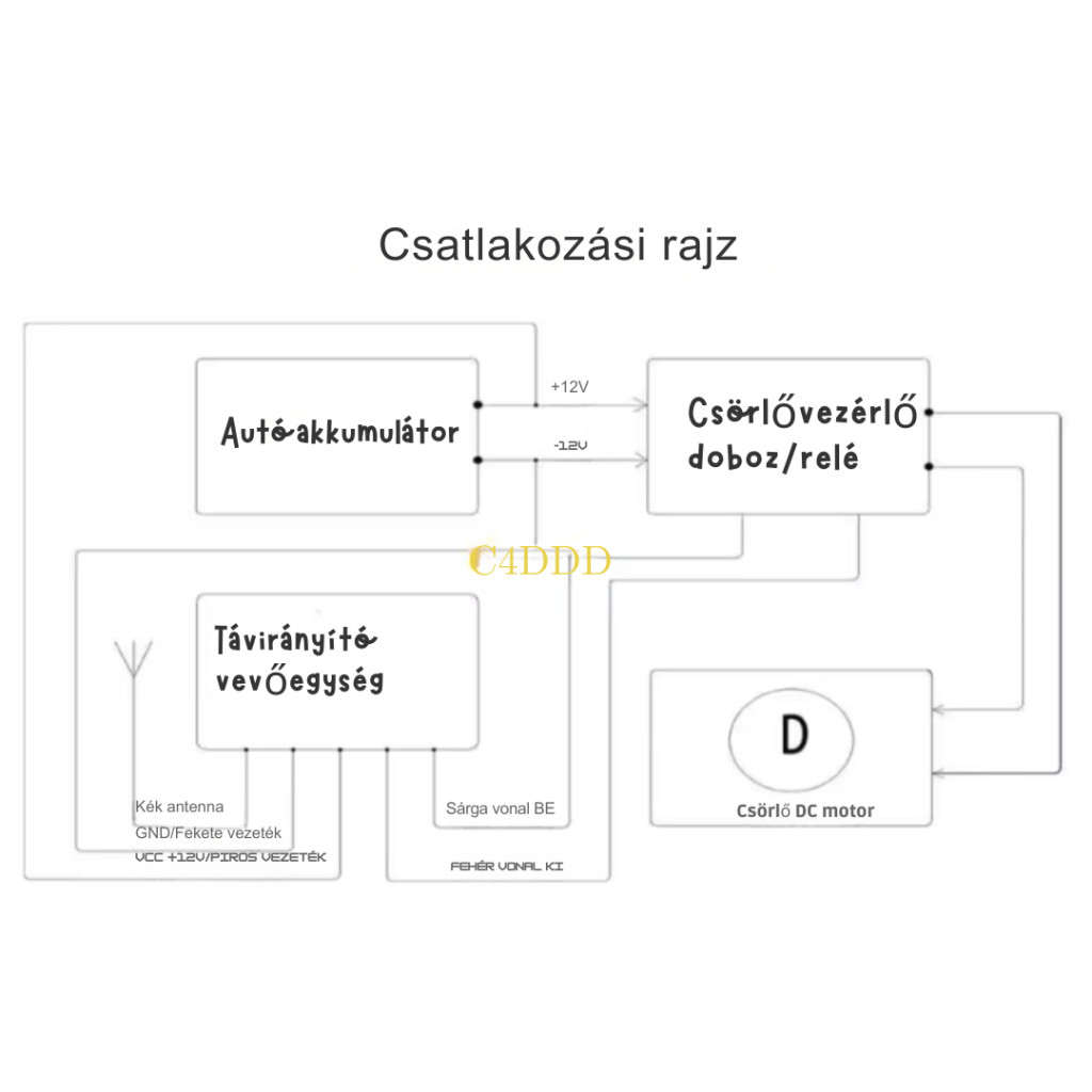 Fehér vezeték: vezérelt áramkör, csörlő esetén kötél ki