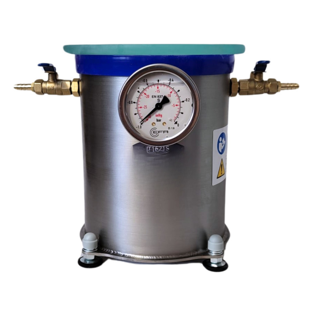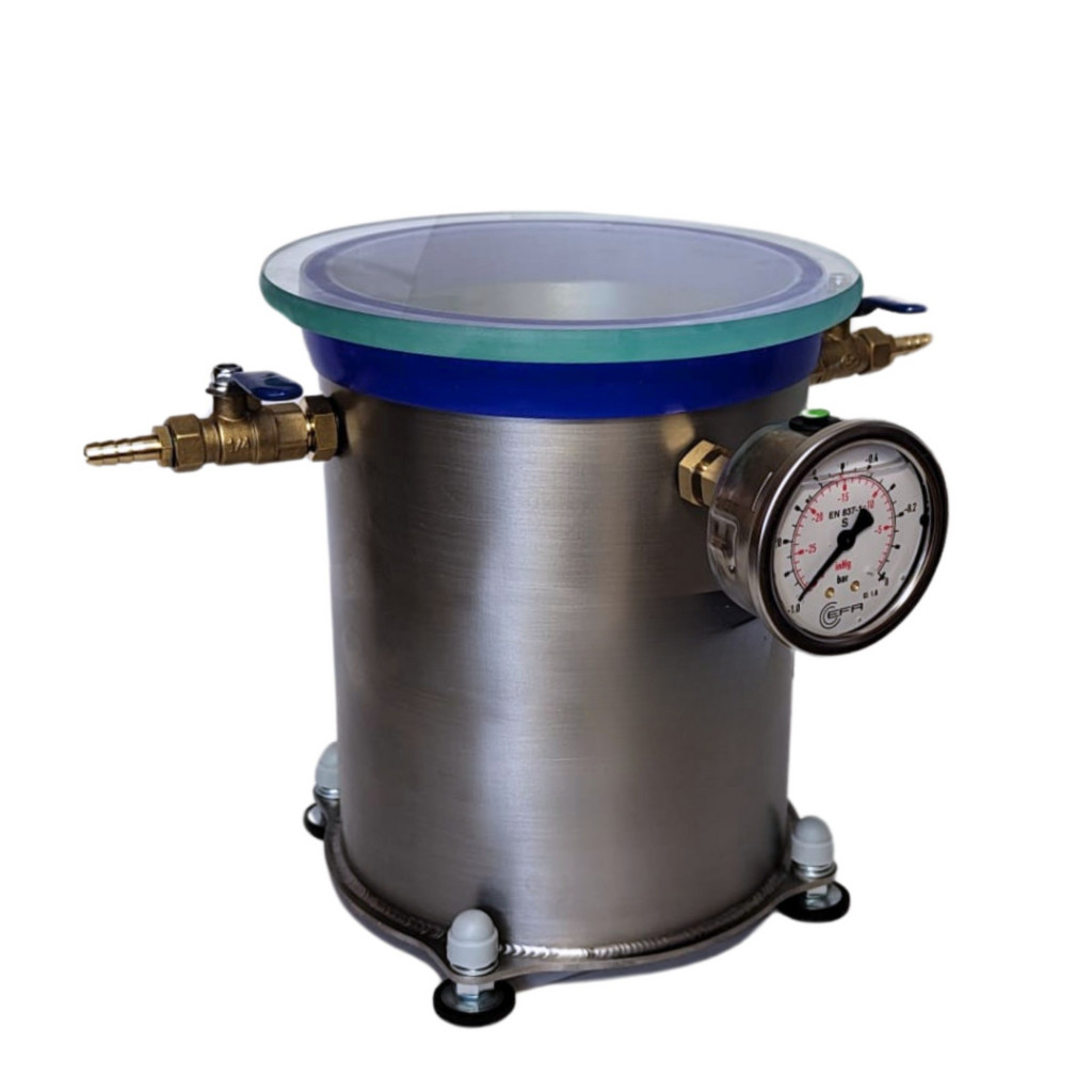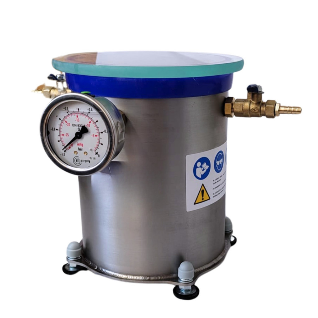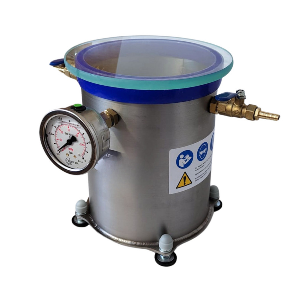 A kamra teste rozsdamentes acélból készült, űrtartalma 4,2 liter, belső méretei: átmérője 16 cm, magassága 21 cm. A fedél 12 mm vastag edzett üvegből készült. A kamra szilikon tömítéssel van ellátva. Az alkalmazott tömítés megbízható és alacsony érzékenységű a mechanikai deformációra. A fedél kiváló átlátszósága lehetővé teszi a folyamat megfigyelését. A golyóscsap lehetővé teszi a folyamat szabad szabályozását, a felszerelt glicerin vákuummérő pedig a kamrában lévő aktuális vákuumot mutatja. A kamra egy pneumatikus csatlakozóval ellátott szivattyúhoz csatlakozik, amely egy 8 mm belső átmérőjű és 1,5 m hosszú megerősített tömlőbe van beépítve. A termék a legmagasabb minőségű anyagokból készült, és a menetek márkás tömítőanyaggal vannak ellátva.