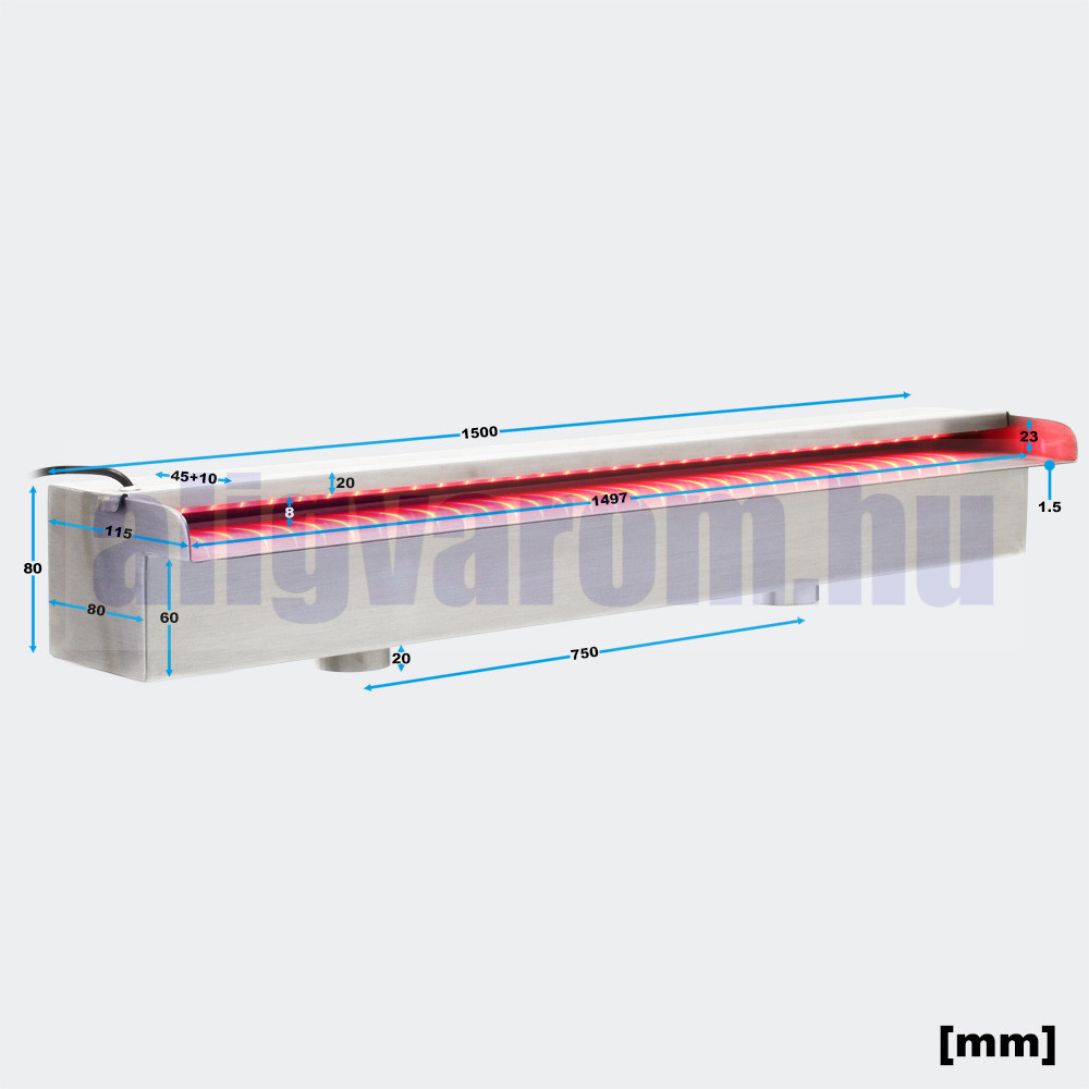 látványosságot hozhat létre kerti tavakban, medencékben. A 150 cm-es méret ellenére a vízesés könnyen rögzíthető a falakhoz vagy beépíthető a falba. Este is használhatja, mert az opcionális távirányítós LED világítás sötétben is harmonikus hangulatot biztosít. Szükség szerint a világítás az RGB spektrum bármely színére beállítható.A vízesés kiváló minőségű, rozsdamentes 304 SS rozsdamentes acélból készül, amely még a klórnak és a sós víznek is ellenáll. A vízesés használatához külön rendelkezésre álló tószivattyúra van szükség. Erre még az alacsony energiaigényű kis szivattyúk is tökéletesen megfelelnek.